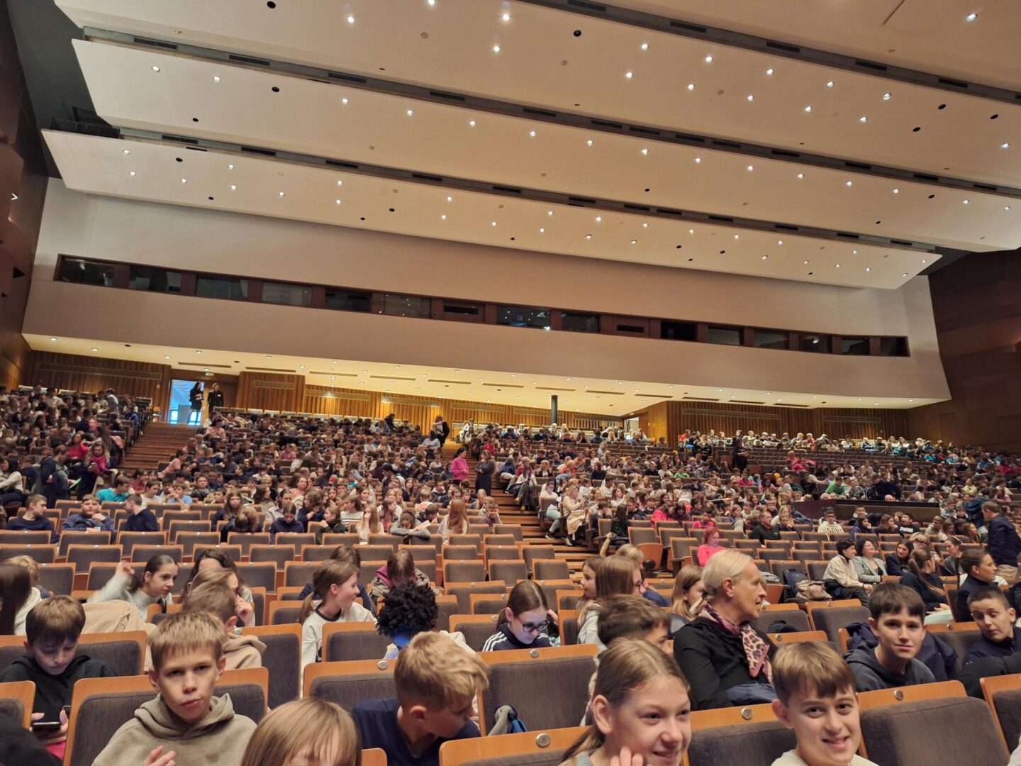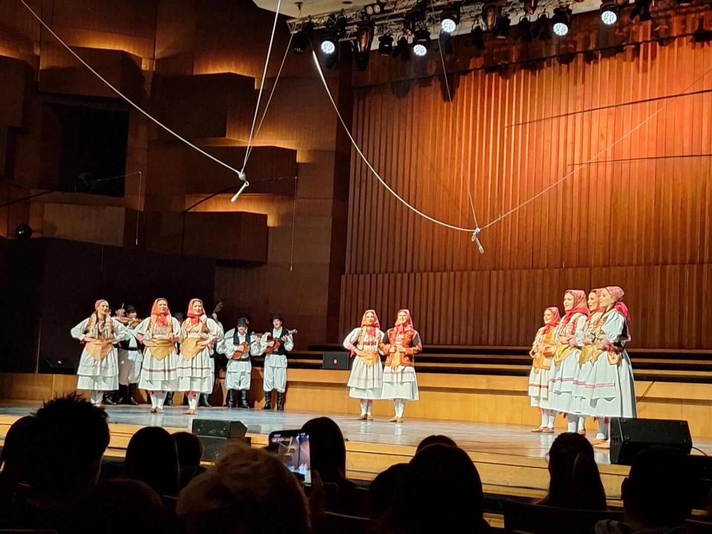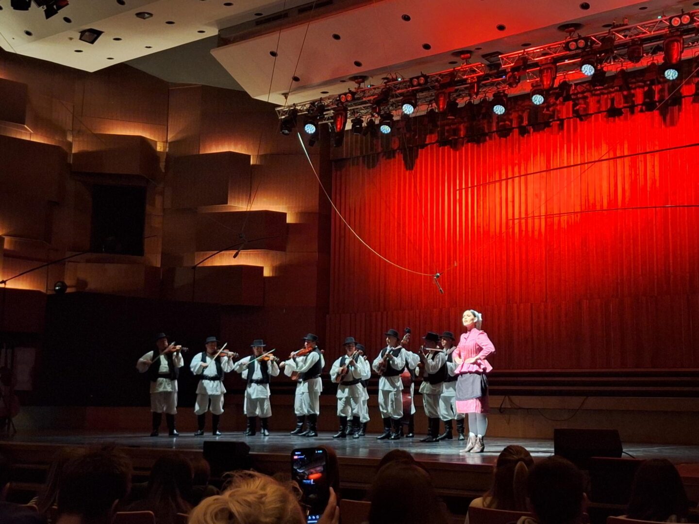 Nakon Muzeja zaboravljenih priča učenike smo poveli na kratak razgled centra grada, a nakon toga uputili smo se do Koncertne dvorane Vatroslava Lisinskog. Ispred dvorane okupili su se učenici mnogobrojnih hrvatskih škola koji su na isti način kao i mi došli posjetiti dvoranu i prisustvovati školskome satu s Ladom. „Školski sat s Ladom” popularni je projekt Ansambla LADO koji se izvodi od početka 2023. godine. U sklopu ove matineje, Ansambl je predstavio učenicima vrhunsku tradicijsku umjetnost, kroz ples i pjesmu njegovih profesionalnih umjetnika – plesača pjevača i glazbenika. Uostalom učenici petih i šestih razreda uče u školi o hrvatskoj glazbenoj baštini. Ova izvedba, kako joj i samo ime kaže, traje jedan školski sat tj. 45 minuta, a inače se izvodi u Velikoj plesnoj dvorani Ansambla LADO. Posebnost tog projekta je u tome što jedini profesionalni folklorni nacionalni ansambl najmlađoj publici je prezentirao sve bogatstvo hrvatske tradicijske umjetnosti, ukazujući na posebnost njezinih regija, ali i umjetničku jedinstvenost Ansambla.
