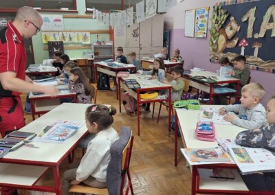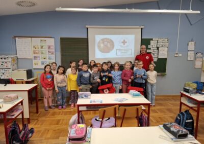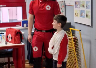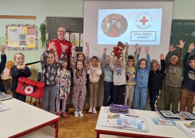 Radionica je bila ispunjena smijehom, znatiželjom i zajedništvom, a učenici su na kraju ponosno pokazivali svoje nove vještine. Za uspomenu na ovaj zanimljiv susret svatko je dobio prigodnu slikovnicu o prvoj pomoći te razrednog medu s logom Crvenog križa, koji će ih podsjećati na važnost pomaganja drugima.